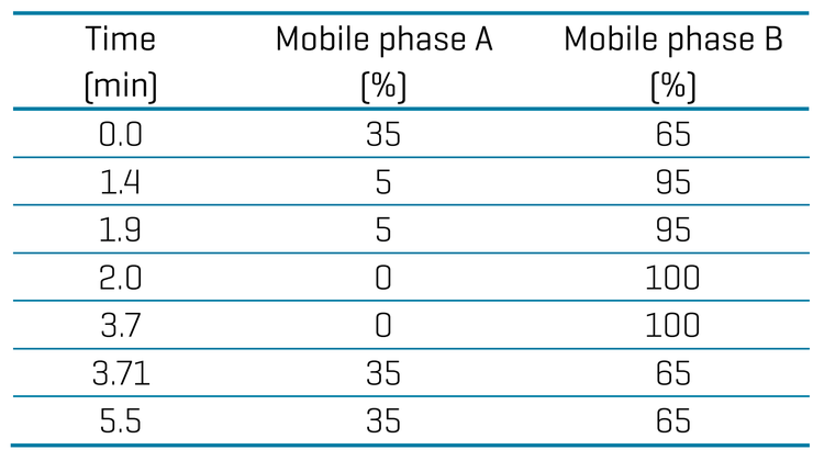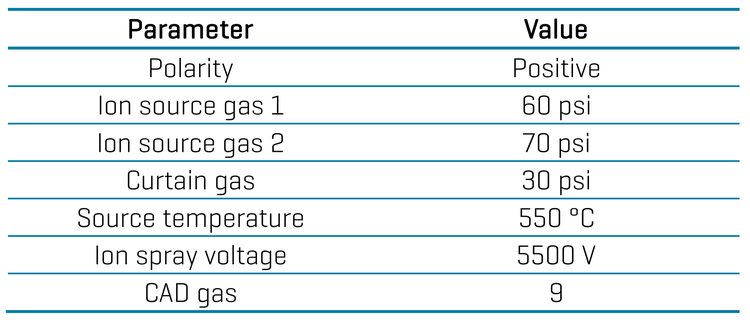 Liquid chromatography: Chromatographic separation was achieved using a Phenomenex Kinetex Luna Omega Polar C18 column (50 x 2.1 mm, 1.6 µm, 00B-4748-AN). Mobile phase A was water and mobile phase B was methanol. The total run time was 6.5 minutes at a flow rate of 600 μL/min. The injection volume was 15 μL. The LC gradient program is presented in Table 1.