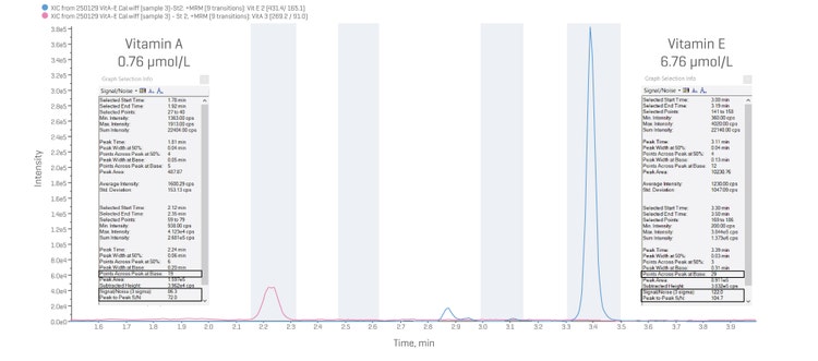 This technical note demonstrates the sensitive and accurate quantitation of vitamins A and E in human serum using a rapid protein precipitation sample preparation procedure with analysis using the SCIEX QTRAP 4500 system. Excellent linearity was observed across clinically relevant concentrations. Low-µmol/L level sensitivity was achieved at the lowest calibrator with signal-to-noise ratios (S/N) of 72:1 for vitamin A at 0.76 µmol/L and 105:1 for vitamin E at 6.76 µmol/L. In addition, the method showed excellent precision and accuracy at low-level concentrations, highlighting the assay's strong quantitative performance.