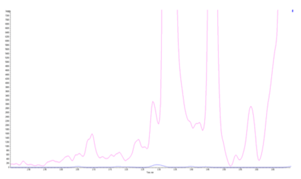 A simple protein precipitation using a small sample volume was proposed, to allow the assay to be run with higher throughput on more and varied sample matrix types, including those with significantly lower available sample volumes. Due to the added specificity of the SelexION DMS Device, matrix interferences inherent to a protein precipitation approach can be minimized. An example of a protein precipitation related matrix effect can be seen in Figure 5. Here the levels of the compound LysoSM (SPC) could have been overestimated by MRM and simple chromatography alone. The LC-MS/MS with DMS chromatogram, shown to a similar scale in blue, shows the peak without the matrix interference seen in the MRM trace in pink.