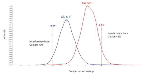 Comparison of Glu-SPH and Gal-SPH performance with and without DMS: Pooled control plasma was spiked at high levels (100 nmol/L) individually with Glu-and Gal-SPH and extracted by simple protein precipitation as previously described. The separation and optimization of the two isobaric compounds, based on COV, is shown in Figure 2. Comparison between performances with and without the use of DMS is shown in Figures 3 and 4.