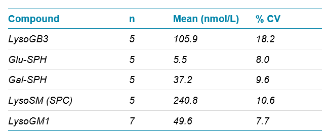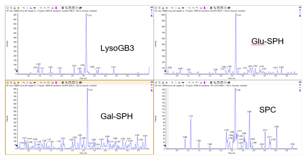 Plasma lysosphingolipids (LysoSLs) have recently emerged as potential biomarkers in a range of sphingolipidoses, including Gaucher disease, Krabbe disease, Fabry disease, Niemann-Pick types A/B disease (NPA/B), Sandhoff disease, Tay-Sachs disease and GM1 gangliosidosis.1 LysoSL profiles are also of potential research importance as a biomarker of Niemann-Pick type C disease (NPC), where secondary storage of sphingolipids is believed to occur. Direct analysis of these groups can be complex due to extensive structural homogeneity between individual compounds. Thus, current methods of analysis of these lipids primarily involve either enzyme activity procedures or derivatization of compounds prior to analysis.