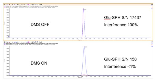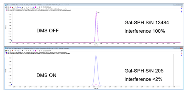 Figure 4.  Comparison between “DMS off” and “DMS on” for a Gal-SPH extracted spiked sample. The Gal-SPH extracted spiked sample shows nearly complete isolation of Gal-SPH from the competing isobaric Glu-SPH