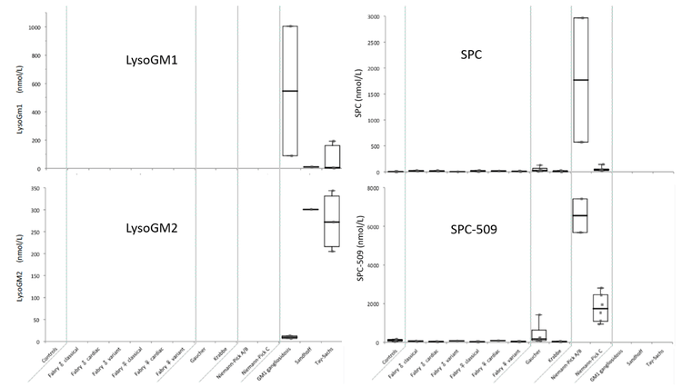 Figure 8. Lipid profiles observed across different disease states. Elevated levels of LysoGM1, LysoGM 2, LysoSM (SPC) and LysoSM509 could clearly be seen in specific disease samples.