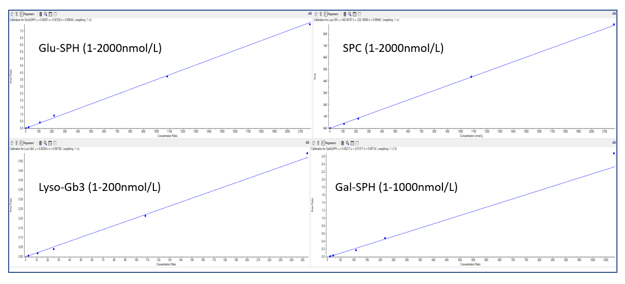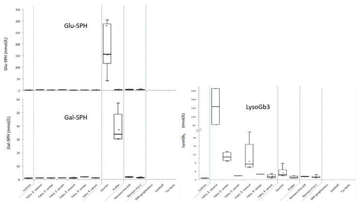 Grouped sample disease state stratification: Serum samples previously analyzed by established methods and identified as specific disease states were reanalyzed by the proposed method. Elevated levels of LysoSLs were detected in the following diseases: Lysosphingomyelin (LysoSM) in Neimann-Pick A/B; the carboxylated analogue of LysoSM (LysoSM509) in both NPA/B and NPC; LysoGM1 in GM1 gangliosidosis; LysoGM2 in both Tay-Sachs disease and Sandhoff disease, as shown in figure 8. LysoGb3 in Fabry disease; GluSPH in Gaucher disease; GalSPH in Krabbe, as shown in Figure 9.