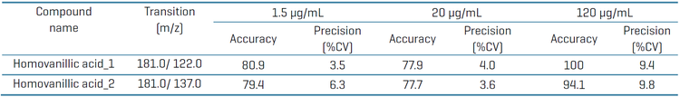 The method reproducibility was evaluated using urine-spiked QC samples at 1.5, 20, and 120 μg/mL (n=5 per level). The QC area counts were normalized to the ISD response and were quantified against the urine matrix-spiked calibration curve. Overall, the QCs showed good accuracy and precision across 3 spiking levels, demonstrating the ability of the QTRAP 6500+ system to produce good quantitative data for the analysis of homovanillic acid in urine (data presented in Table 6). The mean QC accuracy range was 77.7–100% and the mean precision was <9.8%CV.
