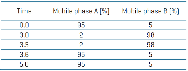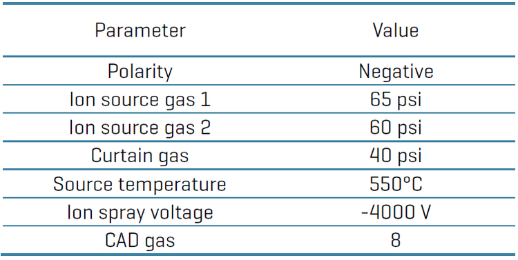 Mass spectrometry: Samples were analyzed using the SCIEX QTRAP 6500+ system with electrospray ionization operating in negative polarity mode. Data was acquired using multiple reaction monitoring (MRM) with the optimized source and gas parameters shown in Table 3 and the compound-specific parameters in Table 4. Two MRMs per compound were monitored.