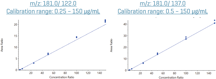 - Linearity across the 0.25-150 μg/mL calibration range with an r² value for the quantifier transition