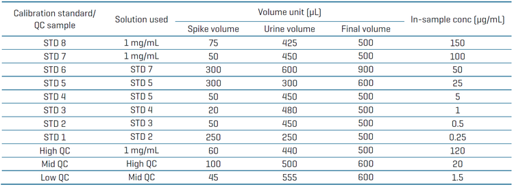 Urine-spiked calibration standards and QC sample preparation: Sigmatrix Urine Diluent (Millipore Sigma) was used as the matrix to prepare the calibration standards (n=3) and QC samples (n=5). Prior to use, a stock of acidified urine was prepared by adding 0.125 mL of acetic acid to 50 mL of the Sigmatrix Urine Diluent. Urine-spiked calibration standard and QC samples were prepared using the scheme shown in Table 1.