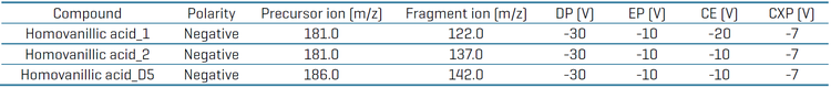 Data processing: Data acquisition and processing were performed using the SCIEX OS software (version 4.0.0.8559). The raw homovanillic acid area count was normalized to the ISD response.