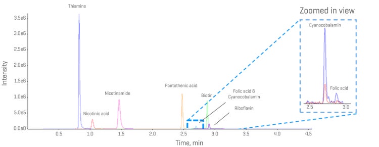 - Rapid sample preparation: Water-soluble vitamin complexes were extracted from human serum samples using a protein precipitation procedure
