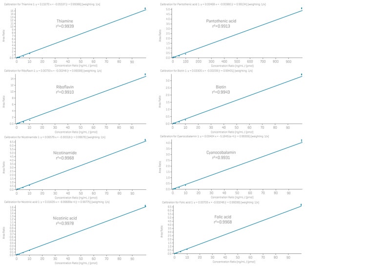 - Excellent linearity: calibration curves for the 8 water-soluble vitamins showed r2 values above 0.99 across the calibration range