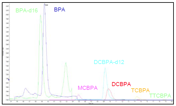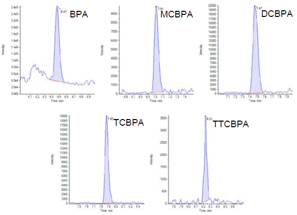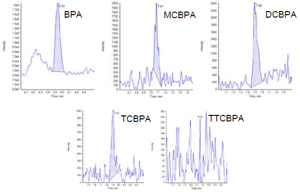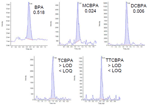 The method was applied to anonymous human plasma samples previously identified as positive for end stage renal disease. Figure 6 shows a chromatogram obtained from a human plasma sample in which BPA and ClxBPAs were found. BPA was quantified in all ten samples with concentrations ranging from 0.266 to 86.8 ng/mL while MCBPA, DCBPA and TCBPA were quantified in two, one and one sample, respectively. TTCBPA was detected in three out of the ten samples. It is clear therefore that some samples show evidence of exposure to both BPA and ClxBPAs while others are only exposed to BPA.