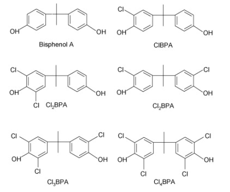 Bisphenol A (BPA) is a well-known chemical found in polycarbonate, polysulfone and epoxy resins, used in mass production for many consumer products. BPA exhibits endocrine disruptor properties that can potentially induce adverse health effects. In aquatic environments, it can react with chlorine to produce chlorinated derivatives (ClxBPAs). ClxBPAs are believed to exhibit estrogenic activity many times higher than BPA itself. Assessing human exposure to endocrine disrupting chemicals (EDCs) such as these is therefore of great importance when considering health risks associated with their use. Due to its ability to separate compounds of similar chemical structure, the specificity associated with direct detection of analytes and the ability to monitor large panels of analytes in a single analysis, LC-MS/MS is a powerful quantitative tool for this application. Figure 1 shows the structurally similar compounds involved.