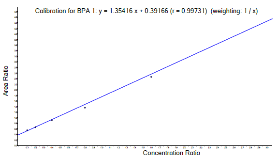 The accuracy of the method was fully demonstrated. The variance did not exceed 17% at the lower limit of quantification (LLOQ) and was 12% at the other concentration levels for intra and inter-day analysis. Trueness or accuracy of the measured peak area ranged from 83 to 115 at the LLOQ, and from 85 to 107 % at the other concentration levels for intra and inter-day analysis. BPA (from 0.1 to 3.2 ng/mL) and ClxBPAs (from 0.005-0.02 to 0.64 ng/mL) calibration curves showed appropriate linearity (r²>0,99) as in the example for BPA (Figure 4). Furthermore, due to contamination of human plasma, an intercept value of 0.320 ± 0.113 was obtained for BPA calibration curves. Indeed, BPA was detected in plasma from anonymous donors used for standards and quality controls (Figure 5), however it was always at a level markedly lower than the LLOQ (0.1 ng/mL for BPA). This was taken into account in the calculation method by subtracting the BPA/IS peak area ratio of blank plasma from the BPA/IS ratio of each standard used to construct the calibration curve.