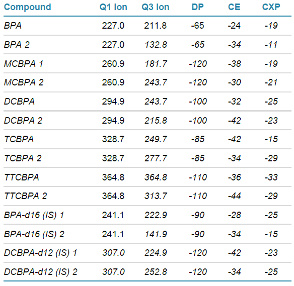 A method has been developed for detection and quantification of BPA and multiple ClxBPAs from human plasma in a single analysis using LC-MRM on the QTRAP 6500+ system. Specific MRM transitions were developed to measure BPA, as well as monochlorobisphenol A (MCBPA), dichlorobisphenol A (DCBPA), trichlorobisphenol A (TCBPA) and tetrachlorobisphenol A (TTCBPA) in human blood plasma.