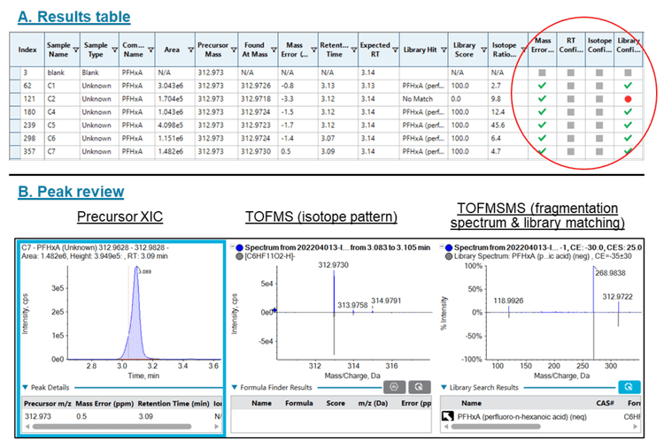 - Initial compound identification was carried out using suspect screening in SCIEX OS for these samples. The confirmation was performed through library matching against the SCIEX Fluorochemical HR-MS/MS Spectral Library.