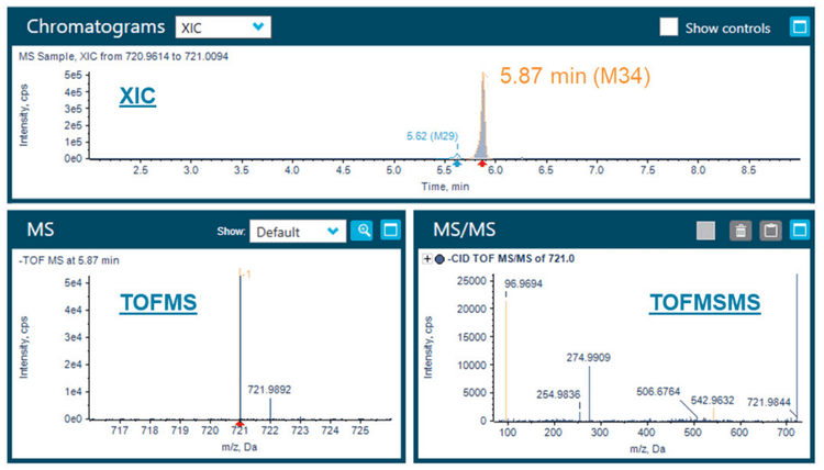 Manual screening of the non-targeted data showed several precursor compounds with PAPs-like characteristics but did not have precursor masses corresponding to known compounds. These features were not on our suspect screening list and were not in the SCIEX Fluorochemical MS/MS library. Specifically, these unknown PAPs-like PFAS showed a negative mass defect, indicating a highly fluorinated chemical and their MS/MS spectra contained the diagnostic m/z 96.9696 Da [PO4H2]- fragment, an unknown intermediate fragment and subsequent [HF] neutral loss. Therefore, the MP processing method was set to search for precursors that contained the m/z 96.9696 Da [PO4H2]- fragment within the TOFMSMS spectra. The MP results table displayed the list of precursors with the diagnostic fragment, which was rapidly screened to confirm the detection of unknown PAPs-like compounds. This confirmation screening was much faster and less tedious than reviewing the original unknown feature list since it contained only a subset of features with the diagnostic fragment. For example, the MP software found the m/z 720.9859 Da (RT = 5.87 min) feature in sample #1 as an unknown of interest (Figure 4). The MP software also displayed the XIC and TOFMS and TOFMSMS spectra for the feature, which confirmed the presence of the 96.9696 Da [PO4H2]- fragment. In addition, the TOFMSMS spectrum showed the m/z 274.9909 Da fragment and the associated [HF] neutral loss fragment of m/z 254.9836 Da. Interestingly, the m/z 542.9632 Da fragment was also observed, characteristic of PAPs compounds with 8:2 fluorotelomer phosphate linkages, such as the 8:2 monoPAP, diPAP and triPAP compounds. Presumably, the associated [HF] neutral loss was not observed due to the low abundance of the m/z 542.9632 Da fragment.