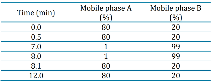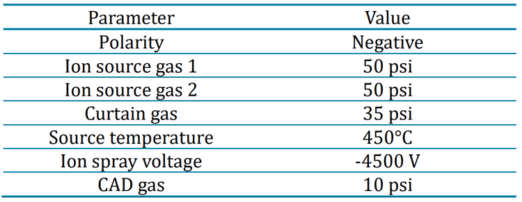 Chromatography. An Exion AD system was used that had been modified to replace the fluoropolymer tubing with PEEK. In addition, a delay column was used between the pumps and autosampler to reduce the PFAS contamination originating from the LC system. Both the analytical (100 x 2.1 mm, 1.6 µm) and delay (50 x 3 mm, 5 µm) columns were the Phenomenex Luna Omega PS C18. Mobile phases were water (“A”, modified with 10mM ammonium acetate) and methanol (“B”, modified with 10mM ammonium acetate). The flow rate was 0.6 mL/min and chromatography was performed using the gradient conditions described in Table 1. The column oven was set to 40oC, and the injection volume was 10 µL.