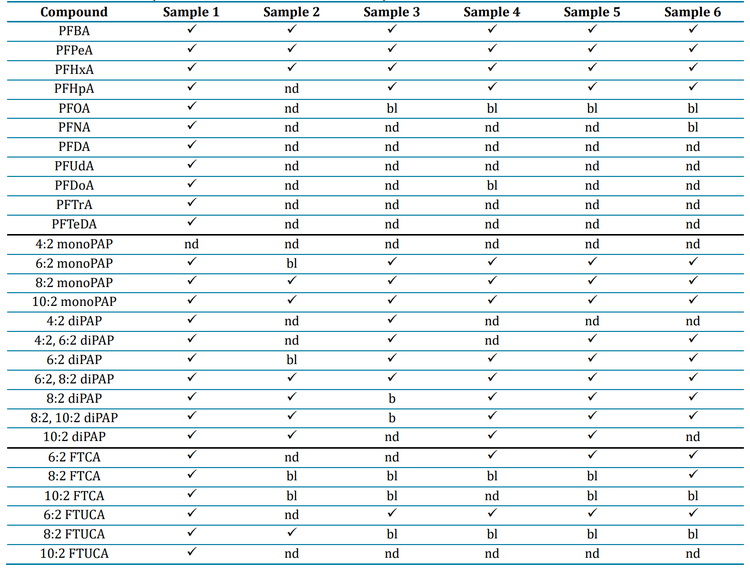 Table 4 shows the most frequently detected PFAS compounds in the six cosmetic samples with the highest PFAS abundance. Overall, the samples contained several chain-length homologues of PFCAs, mono- and di-PAPs, FTCAs and FTUCAs. The PFSAs and perfluorinated sulfonamides were not detected in any sample. Similarly, none of the novel ether acids, such as 8:2 Cl-PFESA, were detected and the FTS compounds were not detected with exception of the 6:2 FTS in sample #1.