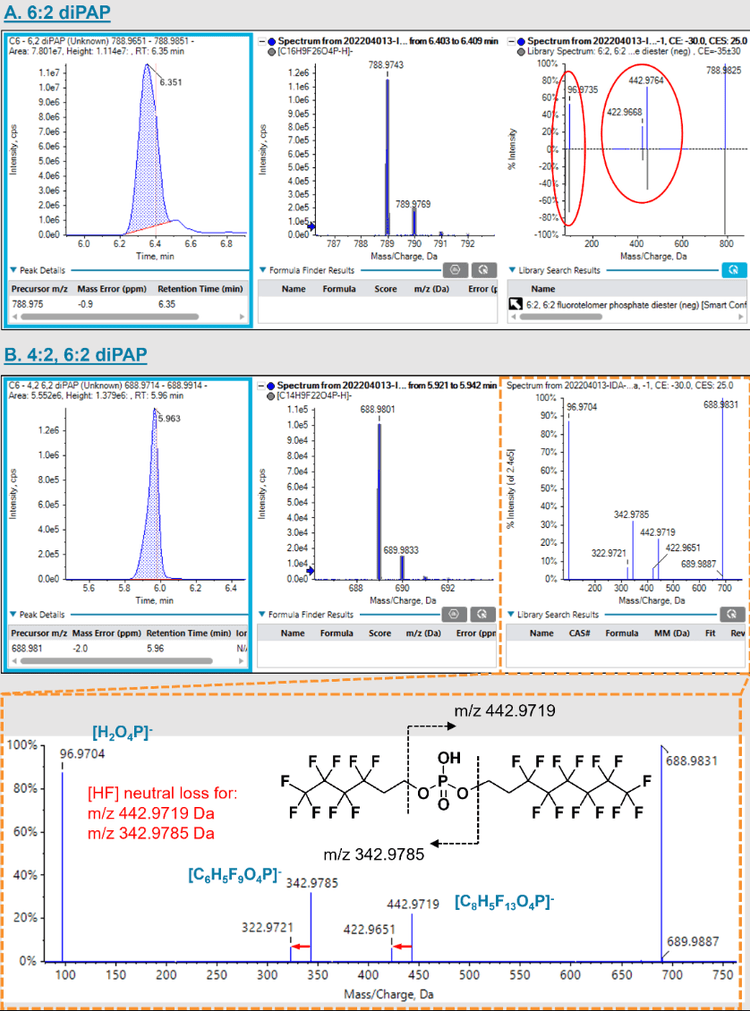 The screening list was expanded to include additional chain-length compounds from the PFAS classes that were detected during the initial suspect screening. PFAS are frequently observed in homologous series and the detection of at least one PFAS compound typically indicates the presence of other chain-lengths. Since these compounds were not contained in the SCIEX Fluorochemical MS/MS library, diagnostic fragment ion matching was used for confirmation. For example, the 6:2 diPAP was detected in several cosmetic samples and confirmed by the SCIEX OS software, which showed a positive match to the MS/MS library. DiPAP compounds typically show characteristic fragmentation patterns which contain the [PO4H2]- fragment (m/z 96.9696 Da), as well as loss of one of the polyfluorinated alkyl “arms” and subsequent neutral loss of HF (Figure 3, top panel). Using the expanded suspect list, Figure 3 shows the 4:2, 6:2 diPAP detection in cosmetics sample #6. The precursor mass error was -2.0 ppm, the isotope ratio difference was 0.9%, and the MS/MS spectrum contained the m/z 96.9696 Da [PO4H2]- fragment, loss of the 4:2 and 6:2 polyfluoroalkyl chains (observed m/z 442.9719 Da and m/z 342.9785 Da, respectively) and subsequent HF neutral loss (observed m/z 422.9651 Da and m/z 322.9721 Da, respectively).