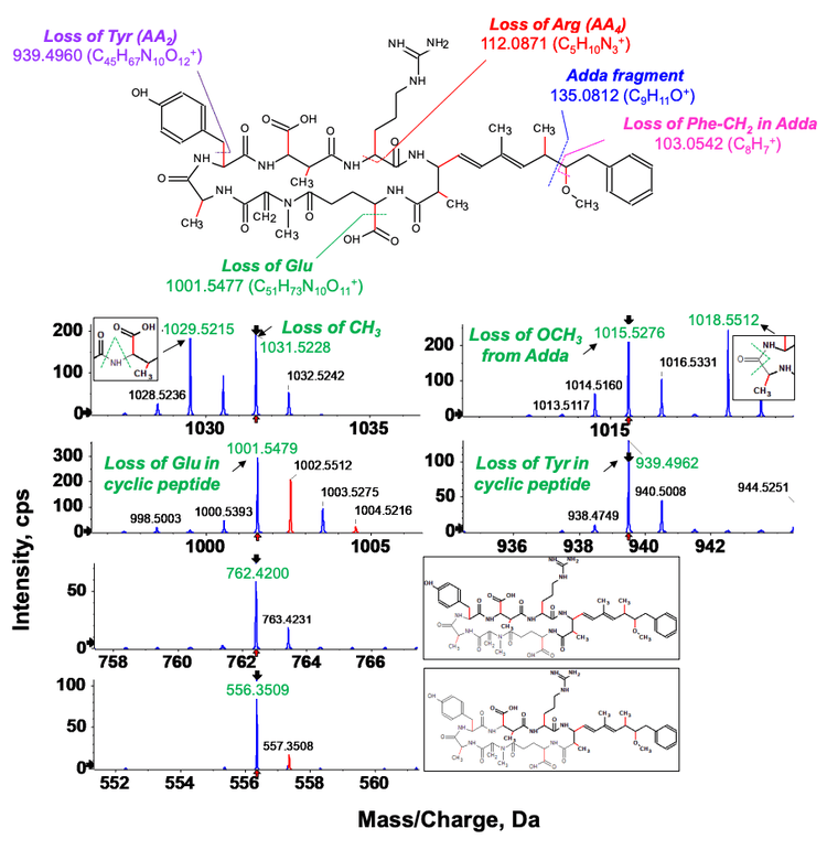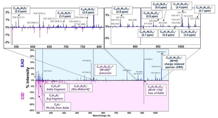 - In this work, EAD fragmentation on the ZenoTOF 7600 system was used to provide complementary MS/MS data for the structural elucidation of MCs when CID MS/MS spectra were not sufficiently informative.