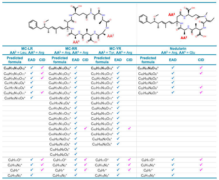 Over 120 congeners of these cyanobacterially-derived hepatoxins have been identified to date,1 where the structural diversity stemmed from variable amino acid substitutions within the cyclic peptide structures of MC and nodularin (NOD) (Table 1). Conventional immunoassay-based methods typically lack the specificity to unambiguously identify individual congeners,2 while CID-based MS/MS analysis often produces non-selective fragments due to fragmentation primarily occurring at a common side chain present in all MC peptides. As a result, fragment-rich MS/MS spectra generated from unique and alternative dissociation pathways is critical for identifying and differentiating known and new microcystins, which may be numerous based on the possible amino acid configurations in the cyclic peptide.