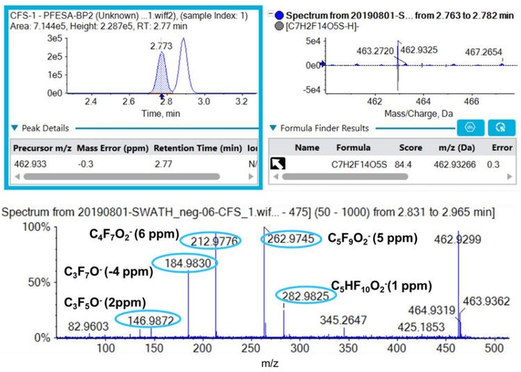 For example, figure 1 shows the identification of NVHOS (C4F8H2O4S) in a sediment sample. The SCIEX OS software shows a good mass error (5 ppm). Further, the major MS/MS fragment ions of [SO3] - , [FSO3] -, and [CF3CF2O]- were present, which is consistent with spectra reported in the literature1, 2 . Based on recent reporting criteria3 , the identification confidence was level 2b. Figure 3 shows another example of using this approach, the positive detection of the PFESA Byproduct 2 compound in a sediment sample. The software showed excellent mass error (-0.3 ppm) and isotope ratio score (84.4), and the major experimental MS/MS fragment ions matched those from chemical standard1 . In addition, PFESA byproducts identified are shown in Table 1.