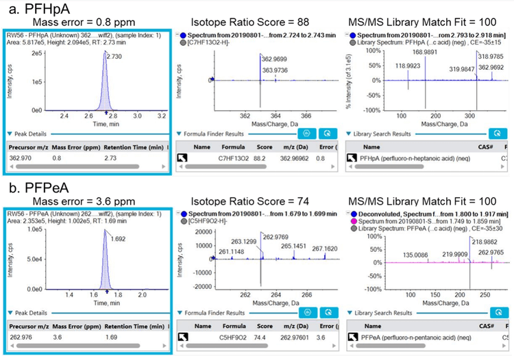 Suspect screening workflows monitor a list of target compounds, utilizing either the chemical formula or exact mass to generate the extracted ion chromatogram (XIC). The compound identification is confirmed using the exact precursor mass error (accuracy <5 ppm) and isotope ratio score. Further, the MS/MS spectrum is compared to a library database for additional confidence. The SCIEX HR-MS/MS Fluorochemical library 2.0 is a verified library containing MS/MS spectra for ~250 PFAS compounds covering negative, positive and zwitterionic compound classes. For example, this approach was used to confirm the detection of two short-chain PFAS in the river water sample, PFPeA and PFHpA (Figure 2). Both PFAS compounds showed good precursor mass error and isotope pattern match and strong MS/MS library match (library “fit” score = 100 for both compounds). The deconvolution algorithm helps to produce a cleaner fragementation spectrum by removing MS/MS ions from interfering, co-eluting precursors that are not associated with the compound of interest. For example, the SCIEX OS software deconvolution algorithm resulted in a cleaner MS/MS spectrum for PFPeA and improved library matching (Figure 2b).