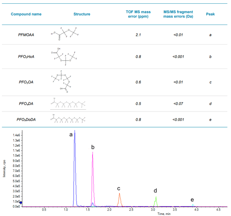To further screen unknown PFAS in this homologous series, a suspect list was built that contained differing -CF2O repeating units based on PFO2HxA. Ultimately, four additional perfluoropolyether were added to the suspect list and confirmed using their diagnostic ions and mass accuracy (Table 2)