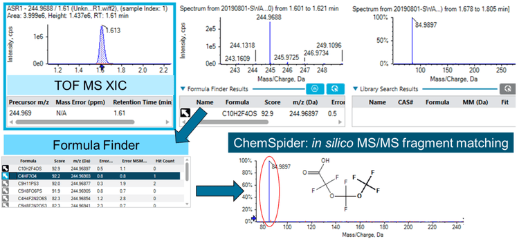 Figure 5 shows the characterization workflow for one feature identified in the KMD plot unknown group, m/z 244.9693, in the aquifer water. Formula Finder identified a potential formula of C4HF7O4, and ChemSpider matched the diagnostic m/z 84.9907 fragment (-CF3O), ultimately identifying PFO2HxA.