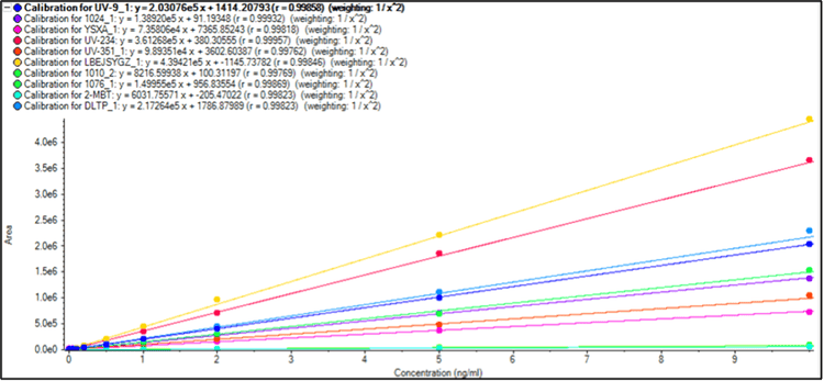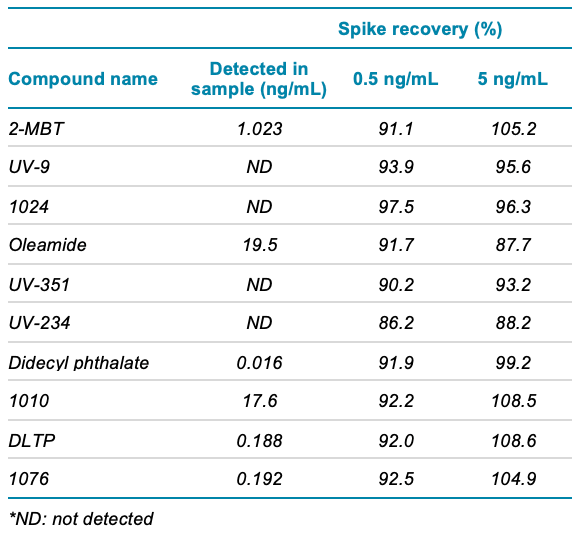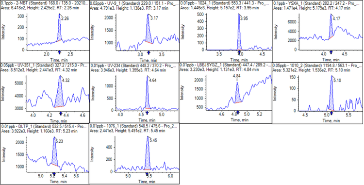 To assess recovery, a treated sample solution was spiked with standard working solutions of 10 additives. The spiked samples were prepared at concentrations of 0.5 ng/mL and 5.0 ng/mL (Figure 4). The recovery results are shown in Table 2. The recoveries of 2 samples with different concentrations of the 10 additives ranged between 86.2 and 97.5% and 88.2 and 108.6%, thereby meeting the method requirements.