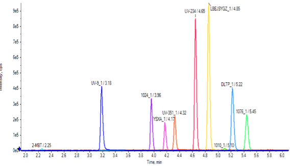 Here, an LC-MS/MS method for the determination of 10 common additives in plastic packaging was developed using the QTRAP 4500 system. The results demonstrate that the developed method is highly sensitivity and has good reproducibility. The use of a delay column upstream of the analytical chromatographic column was shown to effectively remove the influence of substances in the background.