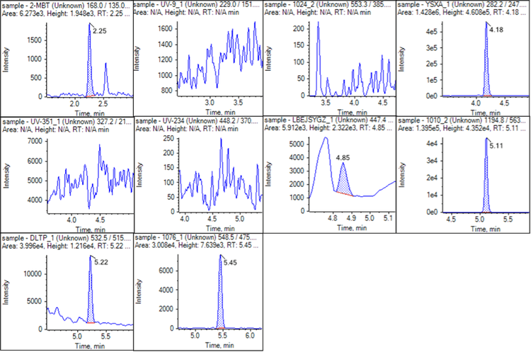 Sample preparation: Ten mL of methanol was added per 1 g of sample. The sample was ultrasonicated for 1 h, then allowed to extract for 24 h. The sample supernatant was then sampled for LC-MS/MS analysis.