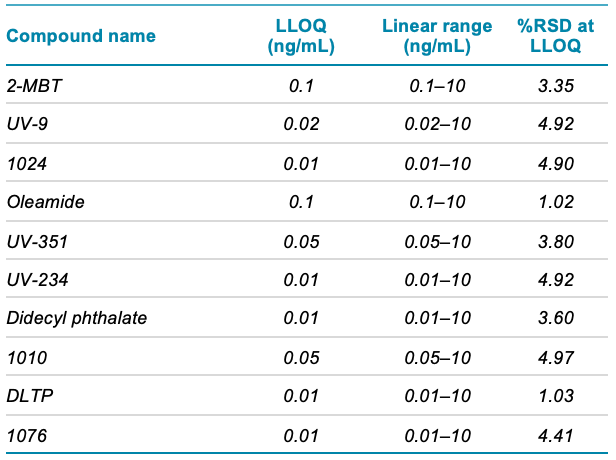 The lower limit of quantification (LLOQ) of the 10 additives ranged between 0.01 and 0.1 ng/mL. A sample was spiked with the 10 plastic additives at their respective LLOQs and then injected 6 times. The RSD from this experiment showed that all analytes were within 5.0% of the expected value (Table 1). The signal observed at the LLOQ for each analyte is shown in Figure 3.