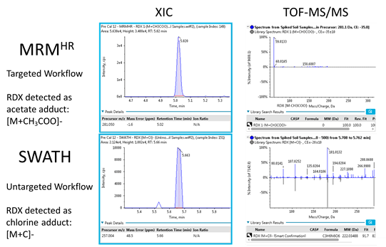 Explosive materials are used in many different applications and are finding their way into the environment. To gain insights on the prevalence and impact of these contaminants, sensitive and robust quantitative assays are needed. Here, a fast and simple sample preparation procedure was developed that provide high compound recovery and samples were analyzed using the SCIEX X500R QTOF system. Both a targeted MRMHR workflow and a non-targeted SWATH acquisition workflow were used to acquire high resolution MS and MS/MS spectra on the 12 explosive compounds. The advantages of each method for identification and quantification of explosives and their various adducts is discussed.