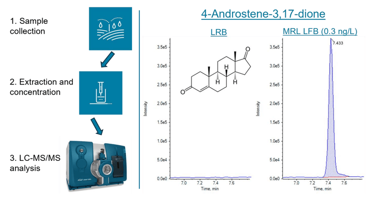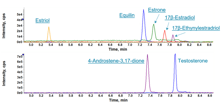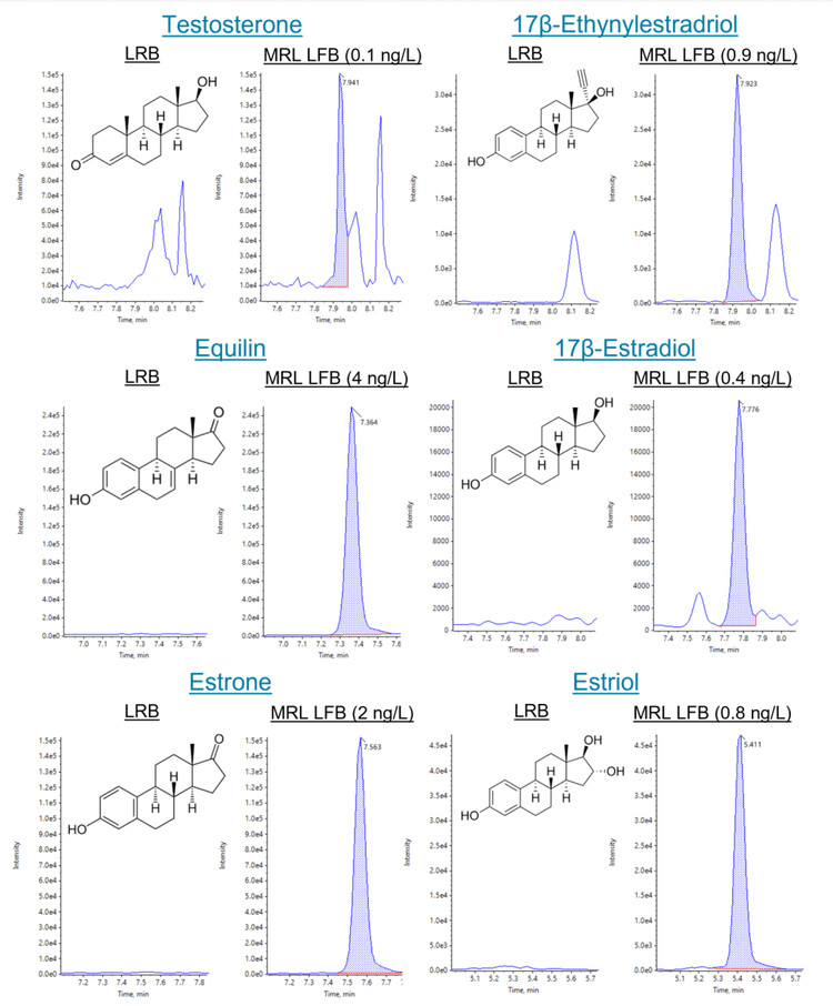 Hormones in drinking water can potentially disrupt endocrine signaling in humans and have been detected in sources of drinking water.2,3 The US EPA Method 539 is a solid-phase extraction (SPE)-based method that can achieve sub- to low-ng/L detection limits in sample for 7 hormones of concern (Figures 1 and 2).