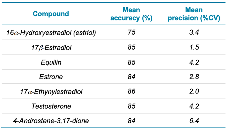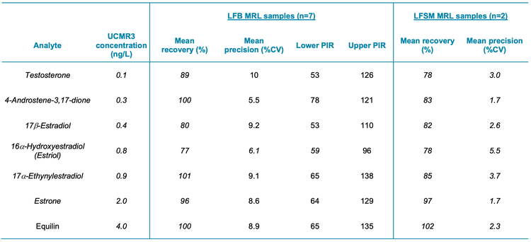Initial demonstration of precision and accuracy: As outlined in sections 9.2.2 and 9.2.3 of the EPA Method 539, the LFB samples (n=4) were 250 mL of blank laboratory water spiked with hormones at 5 ng/L. As permitted by section 8.1.1, the sample volume was reduced to 250 mL and the solvent rinsing and washing volumes were adjusted accordingly. The final reconstitution volume was 250 μL. Sample preparation details are thoroughly outlined in section 11.