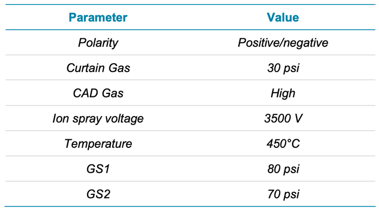 Mass spectrometry: Samples were analyzed using the QTRAP 6500+ system with the IonDrive Turbo V ion source and electrospray ionization electrode. Multiple reaction monitoring (MRM), source and gas parameters were optimized by infusion. Optimized conditions are presented in Tables 2 and 3. The entrance potential (EP) was set to 10/-10 V for all transitions. Data were acquired using MRM mode with polarity switching (pause time = 5 ms, settling time = 15 ms).