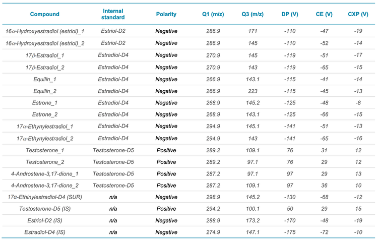 Standard preparation: Standards were purchased from Vivan Life Sciences, Artis Biotech, Pharmaffiliates Analytics & Synthetics and Minerva Scientific Solutions. All standards were purchased as neat powder, except for androstenedione, which was in solution. Intermediate stock solutions of 1 mg/mL were prepared in methanol and used to prepare the calibration standards in 50:50 (v/v), methanol/water, at concentrations ranging from 10 to 10000 pg/mL. The internal standards used included estriol-D2, estradiol-D4 and testosterone-D5.