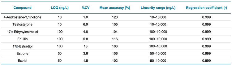Instrument performance for the 7 hormone analytes on the QTRAP 6500+ system was evaluated through triplicate injections of the solvent-based calibration standards (Table 4). The in-vial LOQ concentrations ranged from 10 to 100 ng/L. Estimated in-sample LOQs ranged from 0.01 to 0.1 ng/L, considering the 1000-fold SPE concentration factor. Good accuracy (102-120%) and precision (<7% except for 17β-estradiol, 13%) were achieved at the LOQ level. These results demonstrate the high sensitivity of the QTRAP 6500+ system for hormone analysis. Further, linearity was shown across 2-3 orders of magnitude with r-values >0.999.