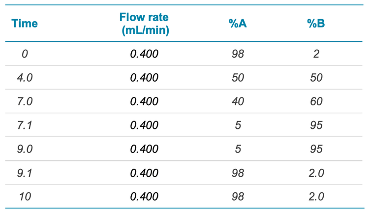 - Rapid chromatographic gradient: The gradient runtime was reduced to 10 minutes, while maintaining good chromatographic separation and analyte peak shape