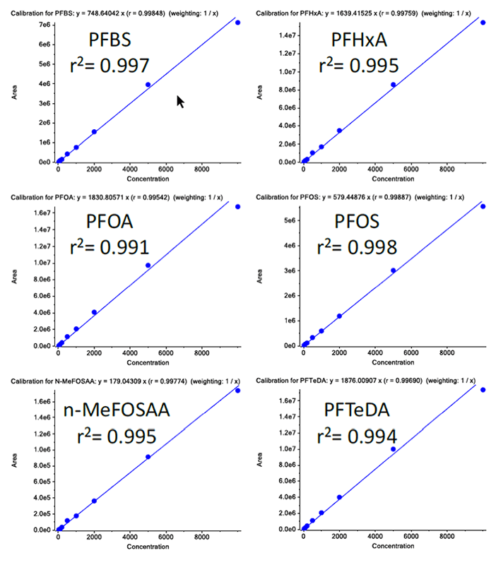 Robust and reproducible results with quantitative accuracy and precision for calculated concentrations, asymmetry factor, and linearity were achieved in a single ten-minute LC-MS/MS acquisition on the SCIEX QTRAP 4500 system. Following stringent protocols for sample preparation and preservation defined by the EPA 537.1 method, method optimization steps were taken to continue to improve PFAS analysis workflow and quantitative performance.