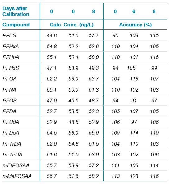 - Sensitive MDLs of 0.08-0.2 ng/L for the entire suite of 14 PFAS compounds were achieved, all of which meet or exceed the requirements of the US EPA’s UCMR3 list for drinking water, and method robustness was demonstrated by sustained accuracy of measured concentration in a QC sample over eight days without need for re-injection of calibration standards.