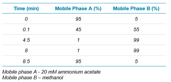 - Total sample runtime takes only 8-10 min, depending on autosampler settings and system dead volume