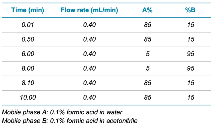 - Fast 10 min chromatographic gradient. Reduced gradient runtime obtained good chromatographic separation and analyte peak shape