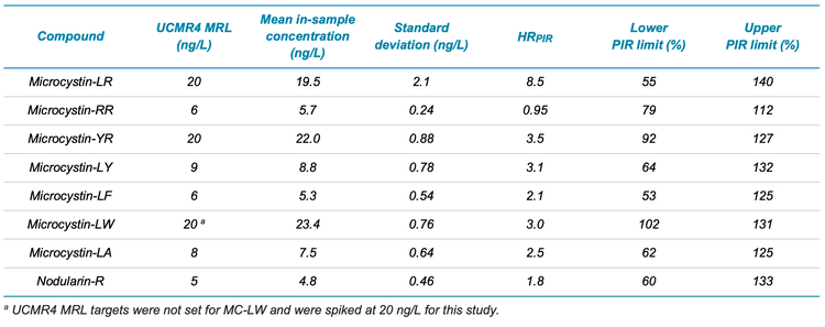 - MRL confirmation at UCMR4 reporting levels. Analysis of 7 replicate samples showed PIR limits between 50% and 150% for all analytes, confirming MRLs ranging from 5 to 20 ng/L (0.005 to 0.02 µg/L)