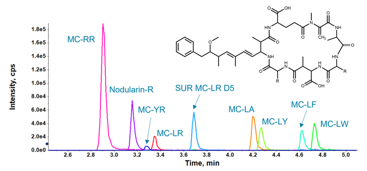 Standards. Ethylated D5 microcystin-LR (MC-LR-C2D5, 98%), was purchased from Cambridge Isotope Laboratories and used as the surrogate standard. Individual microcystin (RR, LR, YR, LF, LW, LY, LA) and nodularin R standard solutions were purchased from CIFGA. The surrogate standard spiking stock and calibration standards were prepared in 90:10 (v/v), methanol/water. Calibration standard concentrations ranged from 0.05 to 100 ng/mL and contained 30 ng/mL of the surrogate standard.