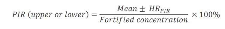Mean recoveries ranged from 88%–117% with %CV ranging from 3.2%–11%. XICs for the LRB and MRL LFB samples are shown in Figures 1 and 3. The mean measured recovery percentage and standard deviation (Table 5) were used to calculate the PIR using the following equation: