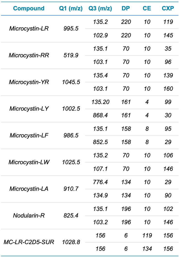 This technical note describes the analysis of 7 microcystins and nodularin in drinking water following United States EPA Method 544.1 The minimum reporting levels (MRL) in the fourth Unregulated Contaminant Monitoring Rule (UCMR4) were confirmed in the initial demonstration of capability (IDC) experiments using the QTRAP 4500 system (Figures 1 and 3). The MRLs met the predicted interval of results (PIR) criteria of 50%–150% recovery and ranged from 5 to 20 ng/L. In addition, the IDC experiments included the assessment of method blanks (<33% MRL) and the determination of accuracy (70–130%) and precision (%CV <20%) in laboratory fortified blanks (LFBs). The use of 250 mL of water samples reduces sample preparation time compared to the traditional 1 L sample volume.