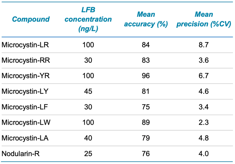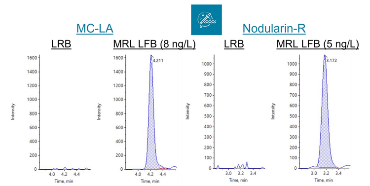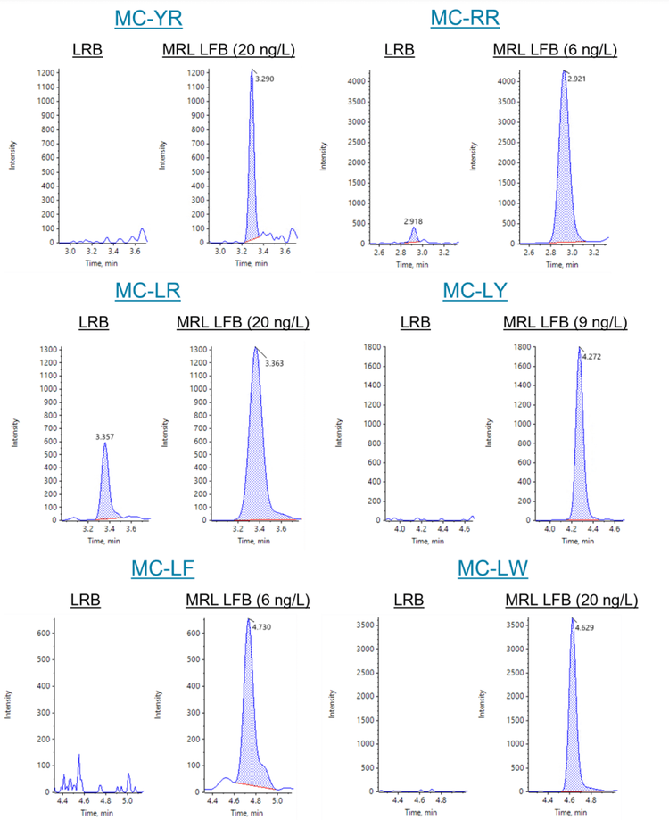 Demonstration of low system background. The extracted LRBs did not exhibit any analyte peaks (n=3) except for MC-LR (Figures 1 and 3). The MC-LR peak originated from the mass-labelled surrogate standard. Overall, these results demonstrate negligible contamination during the sample preparation and instrumental analysis. The criteria that the LRBs must be <1/3 of the MRL concentration were met, including for the MC-LR sample that exhibited minor LRB contamination. Further, none of the analytes were detected in the diluent blanks.